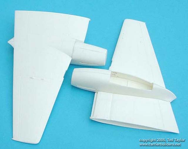I feel there is no need to go into removal of components from the sheets again here as you may well be aquainted with my methods and an equally good description is on the instruction sheets with diagrams. As mentioned there are two versions included so you need to make up your mind early which to do as you need to cut the long nose off the F21 and use the short replacement provided. After making up the pilots cockpit, the observers station and painting the interior of the fuselage around the cockpit areas I added the stiffener as recommended and some tiny 20thou plasticard tabs along the edges of each half of the fuselage, arranged so that they interlaced, at the same time I cleared the holes for the tailplane support and cut out the tailwheel bay area. As I intended to use the cannon nose I lightly scored the area to be removed but did not detach it until the fuselage was hardened off, all the bits were mounted inside and the halves cemented and taped up until hard, a point to note here, never tape up before cementing as the cement can easily creep under or along the tape and ruin your surface undetected. Whilst waiting I had a dry run with the engine nacelles and wings which seemed perfect but I found later that the Radiators were a tight fit at 3mm back from the lip. The wing stiffeners were added, heeding the warning about the choice of cement, and I adjusted the wing so the intake lips were parallel then slid the radiator in from the side as close to the front as possible and superglued it at the same time checking to see the appropriate nacelle half was a good fit.