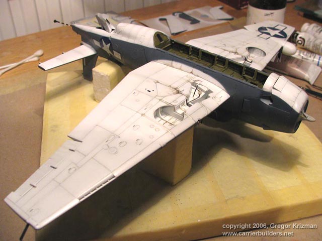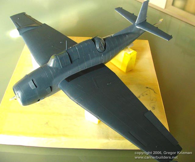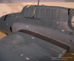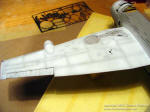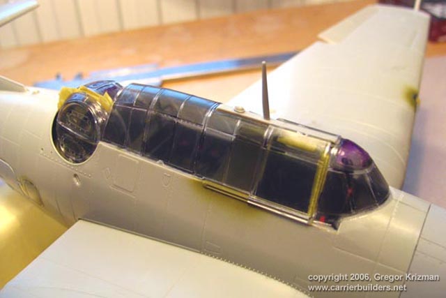 bits, cowl flaps, seatbelts, Wing parts went together with no problems, there are however some sink marks here and there, so they were filled with Mr. Surfacer and sanded smooth. After the model was glued and sanded, it was time to put on clear parts. I have a habit to glue them before painting as they blend in better. Masking the transparencies is a nightmare on this aircraft, so excellent Eduard masks were used. Note that because of gluing the transparencies at that point required that gun turret was installed. After that, the model was wiped off with alcohol and ready for first coat of primer.