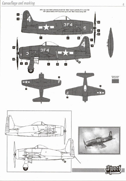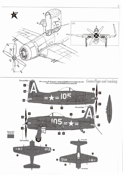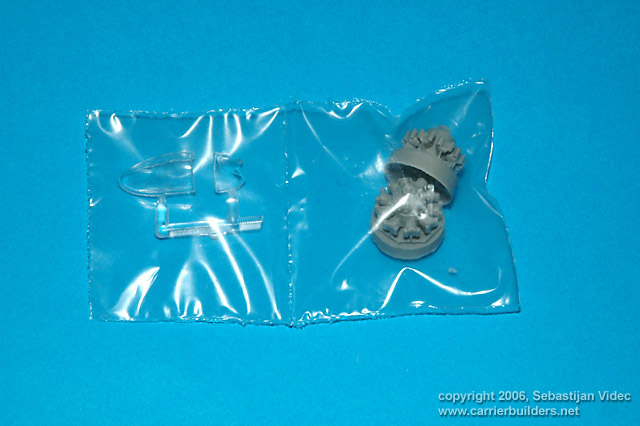 The kit is packed in a sturdy top-opening box. Plastic is packed in a bag, including the decals, while transparent parts and engines are packed separately to avoid scratches... The kit includes 56 injection moulded parts, two-piece canopy and a two resin blocks of engines... My example has two front cylinder parts – I guess they made a mistake with packing. You also receive two decal options; F8F-2 bird of VF-151 during '50s and F8F-1 of VF-3 during 1946. Decals are very nice with minimal carrier film and in perfect register.