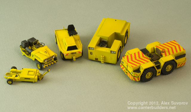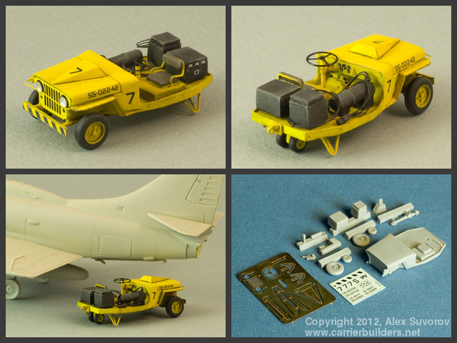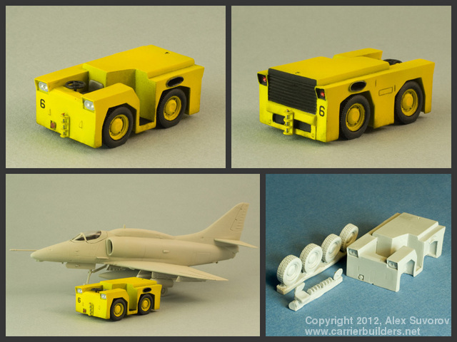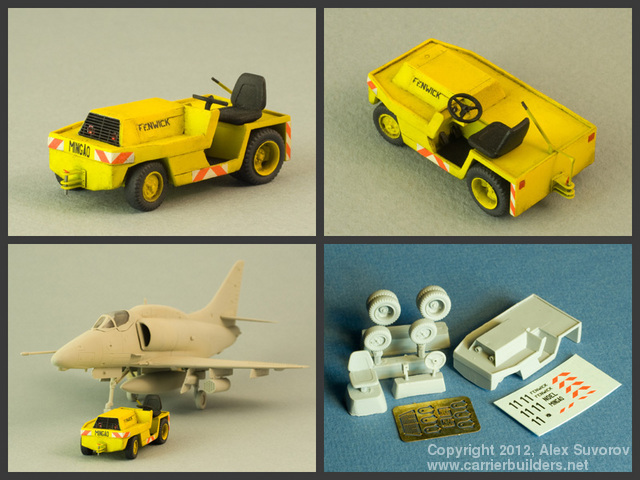 In the late 1960s the Royal Australian Navy's sole active carrier, HMAS Melbourne, underwent a major refit and received a compliment of A-4 Skyhawk attack jets and S-2 Tracker ASW aircraft. Being heavier and larger than the Sea Venoms and Gannets employed previously, the new aircraft needed more powerful tow tractors to position them on the flight deck. Thus a small number of specially built tractors appeared on the Melbourne's flight deck and served until her decommissioning. Besides Skyhawks and Trackers the tractors also handled Wessex and Sea King helicopters. The assembly is fairly straightforward. I used thin wire to make the braces and drawbar pins. For headlights and taillights, I made reflectors from self-adhesive bare metal foil and then applied drops of clear varnish and clear read paint.