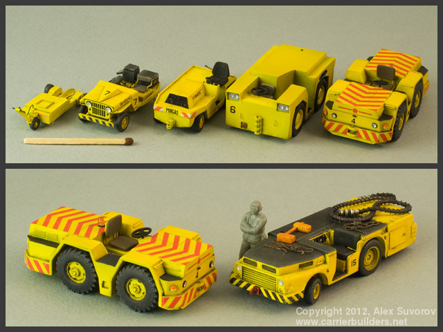 These aircraft tow tractors saw service in the early 1960s on the decks of Clemenceau and Foch carriers of the French Navy. Afterwards, when Foch was sold to Brazil, her compliment of tractors went on to serve with the Brazilian Navy. Thus, a number of such tractors are still in use on A12 São Paulo. This tractor has its headlights hidden under the radiator grille, so this has to be taken into account when assembling and painting the kit. Headlights received reflectors made of bare metal foil and then drops of clear read paint. Again, some thin wire is needed to get the drawbar assemblies right.