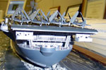 The biggest complaint I had with Hornet…the lack of interior hangar detail… is almost totally rectified in this kit. Unfortunately there are also a lot of ejector pin marks on the inside surfaces of the bulkheads. I sheeted these over with thin styrene sheet, cut to fit. I also added Plastuct I-beam detail to the underside of the flight deck. Most of the hangar doors were cut open, to show the hangar deck details. I built up and added some of the air group to the hangar deck at this point, along with some mechanics and other crewmen from the Tom’s Modelworks photoetch crew set. The idea was to create a busy-looking, working ship.