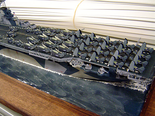 I posed my ship in the midst of spotting her second strike of the day somewhere in the middle of the Pacific. There are 20 planes in her hangar, along with the group being readied for launch on deck. The rest are somewhere else, making life miserable for the Imperial Japanese Navy. The “water” is acrylic silicone caulk spread over a deep blue-painted base, with a final coat of Future on top. I don’t know how many of those teeny little *&^%$#@ Tom’s Modelworks sailors I ended up using, probably 400or so, but I’m cross-eyed now, and sick of painting them for a while.